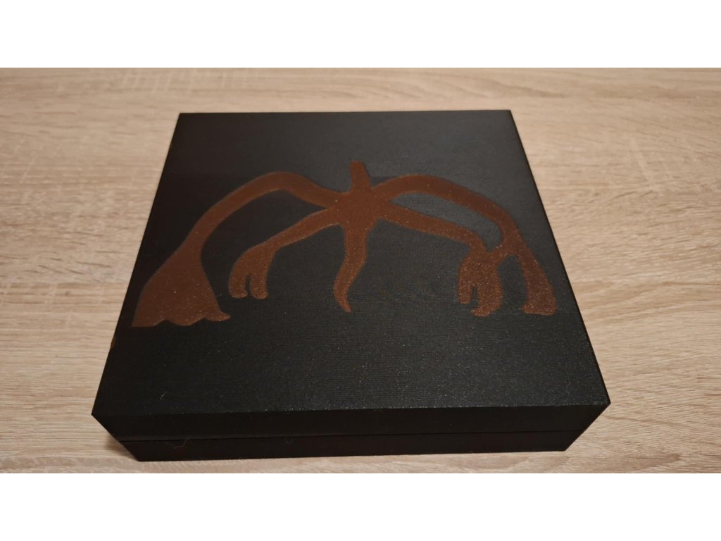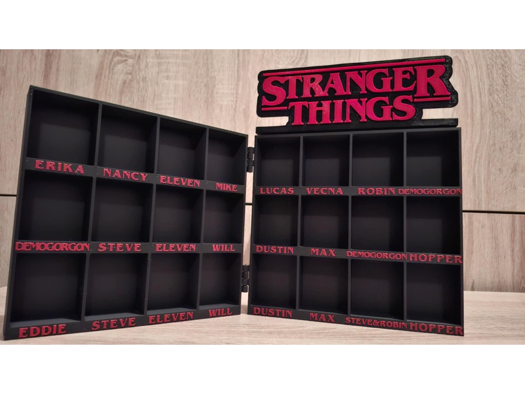Otevřená vitrínka s panty a nápisem pro figurky z Kinder Joy.